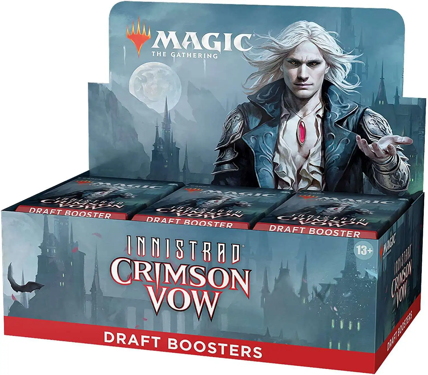 Each Innistrad: Crimson Vow contains 36 Innistrad: Crimson Vow Draft Booster packs (540 cards total), each with 15 Magic cards and 1 ad/token. A foil card of any rarity replaces a Common in 33% of Innistrad: Crimson Vow Draft Boosters. The best booster packs for drafting, one box includes enough packs to draft with up to 12 players.