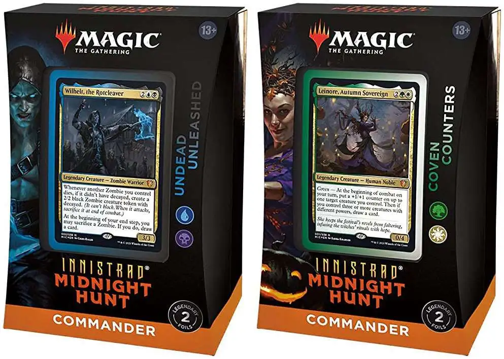 This set of 2 includes both Commander decks from Innistrad: Midnight Hunt. Each Commander Deck features a 100-preconstructed deck ready to play out of the box, plus a deck box and life wheel.