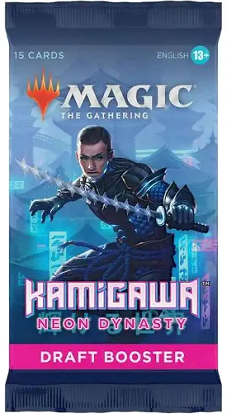 Each Draft Booster contains 15 Magic cards and 1 token, Helper card, or ad card, with a combination of 1 card of rarity Rare or higher, 34 Uncommons, 910 Common cards, and 1 Land card. A traditional foil card of any rarity replaces a Common in 33% of Kamigawa: Neon Dynasty Draft Boosters.