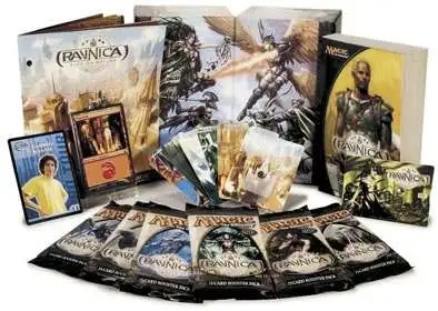The Fat Pack includes a Player’s Guide, six booster packs, a Ravnica life counter, a 40-card Ravnica basic land pack, two card boxes (with card dividers), and the Ravnica novel.