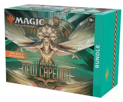 8 Set boosters. 1 storage box. 20 premium lands and 20 normal lands. 1 bundle promo card. 1 oversized spindown. 1 insert.