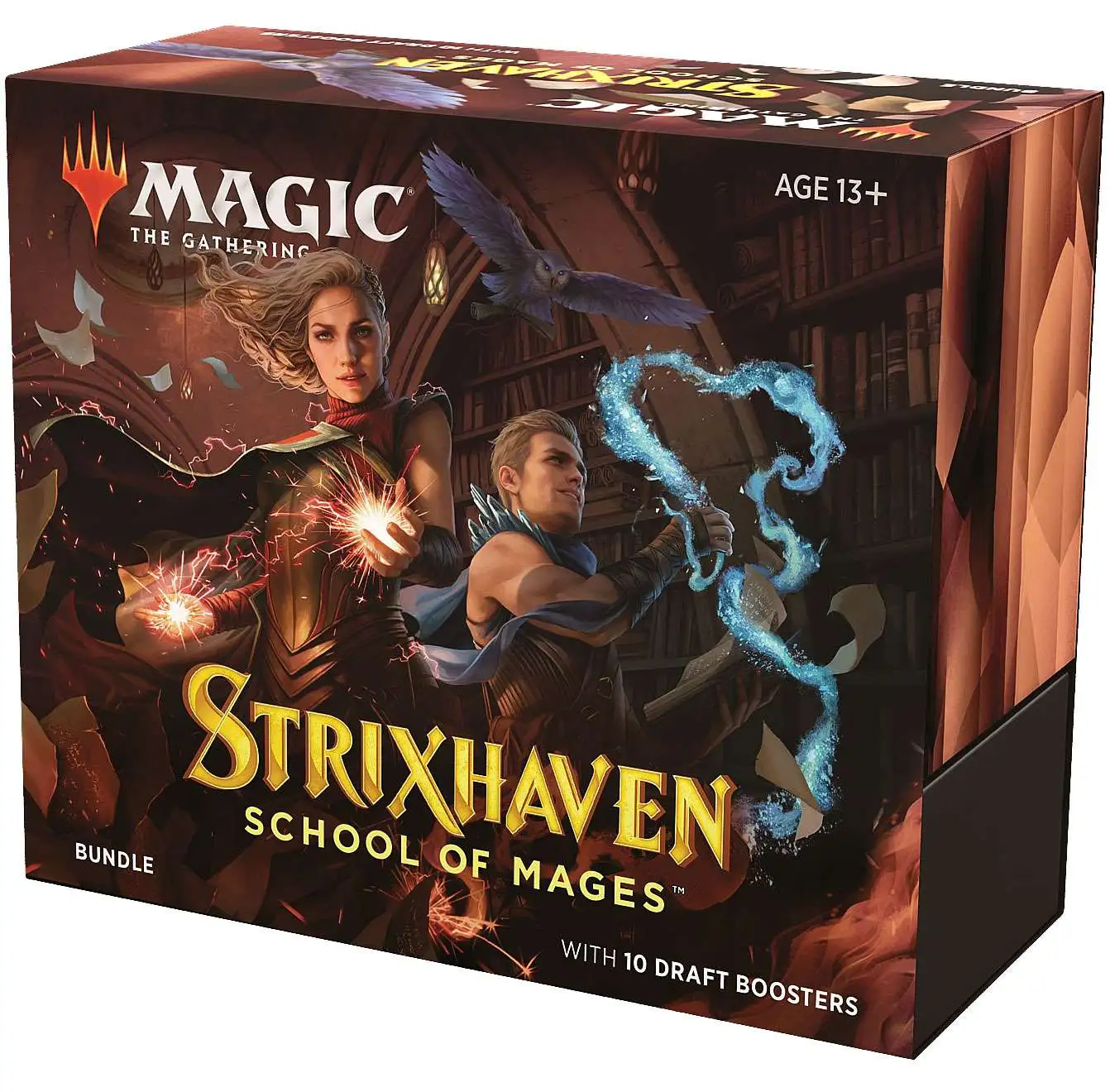 Each Strixhaven: School of Mages Bundle comes with 10 Draft Boosters, an excluse alternate art promo card, 40 basic land cards (20 foil & 20 non-foil), a life counter, and an MTG card storage box. Each Strixhaven: School of Mages Draft Booster Pack contains 15 Magic cards and 1 ad/token.