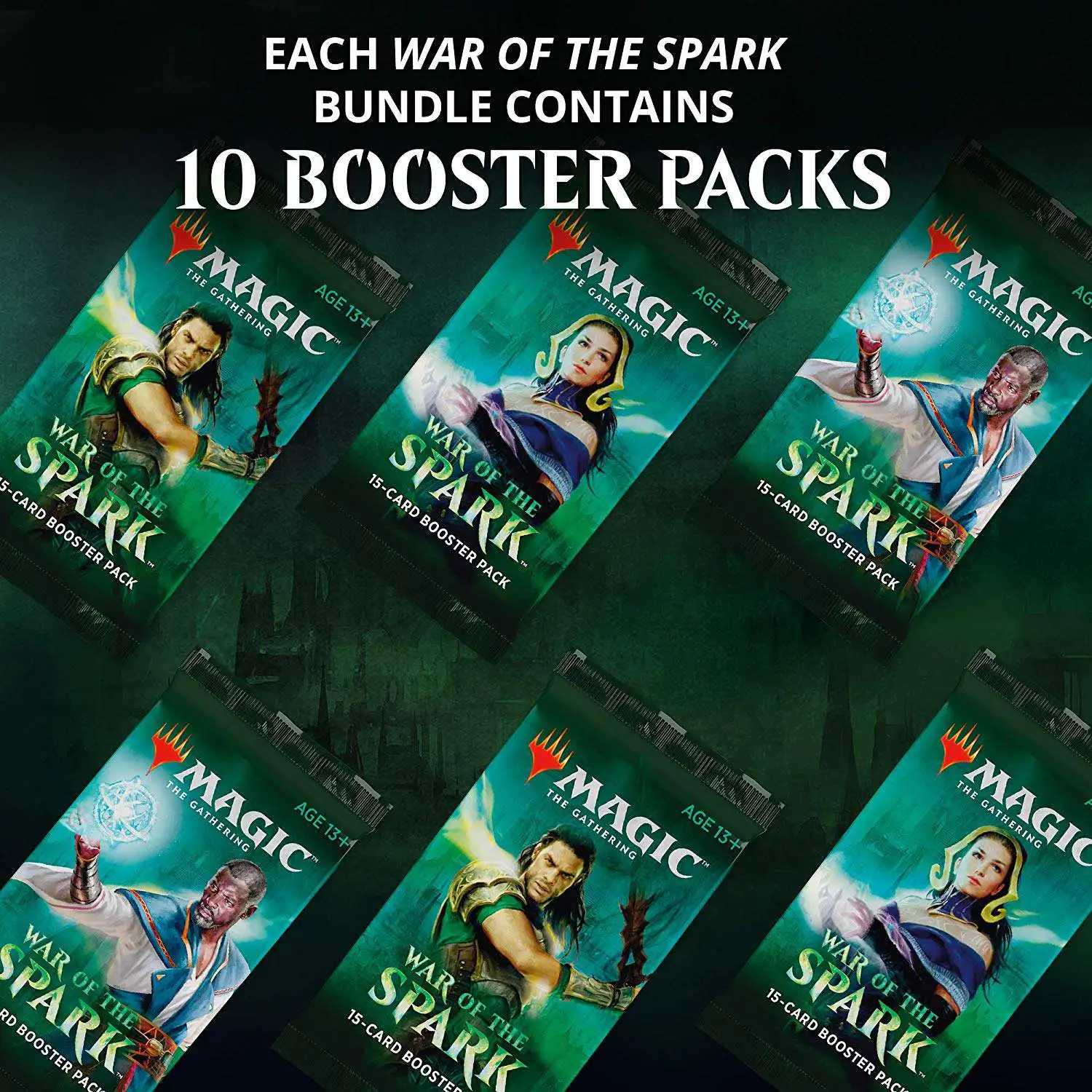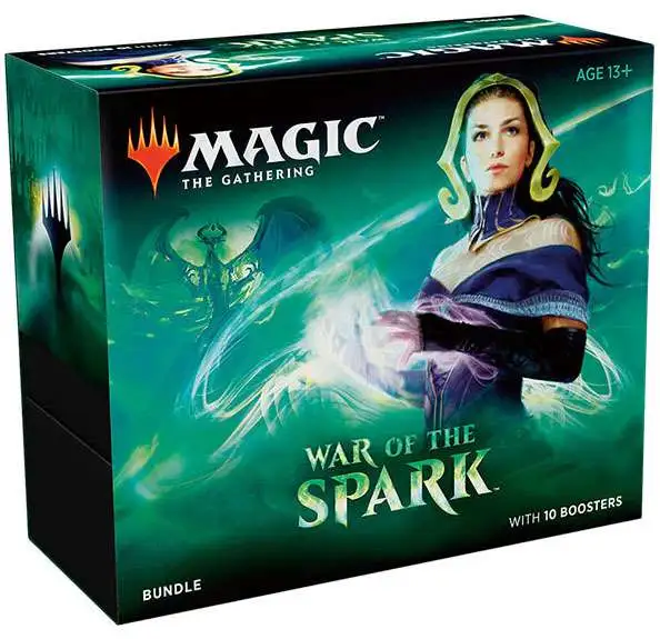Your War of the Spark Bundle includes 10 booster packs with at least one PLANESWALKER IN EVERY PACK, 80 plus basic land cards, 1 Spindown life counter, and a players guide.